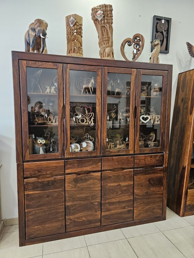 With a well thought-out arrangement of cupboard parts, drawers and a display case, this piece of furniture can be used individually and used both as an attractive eye-catcher and as a generous amount of storage space. As a safe place to store valuable decorative items or as a bookcase. This display case / library, offers the right setting for artistically draping these valuable gems or books.